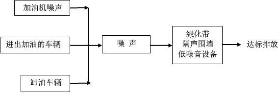 3、噪聲排放及防治措施 項(xiàng)目噪聲污染源主要為加油機(jī)噪聲、進(jìn)出加油車輛、卸油車輛產(chǎn)生的噪聲,噪聲通過(guò)綠化帶,減振墊等措施,盡量降低噪聲對(duì)周邊環(huán)境的影響,噪聲排放流程圖見圖3.2。