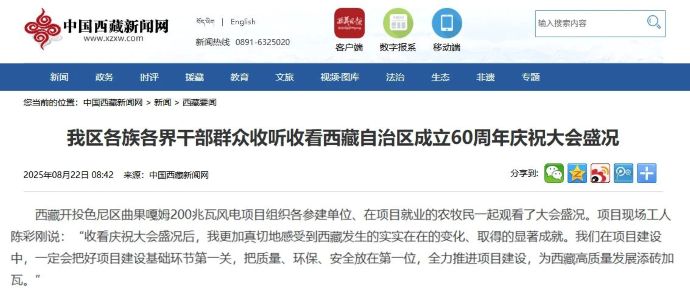 8月22日,西藏開投色尼區(qū)曲果嘎姆200兆瓦風(fēng)電項(xiàng)目組織各參建單位干部職工、在項(xiàng)目就業(yè)的農(nóng)牧民一起觀看西藏自治區(qū)成立60周年慶祝大會(huì)盛況的消息,被中國西藏網(wǎng)、西藏日?qǐng)?bào)、中國西藏新聞網(wǎng)、西藏法制報(bào)等各級(jí)媒體平臺(tái)宣傳報(bào)道。